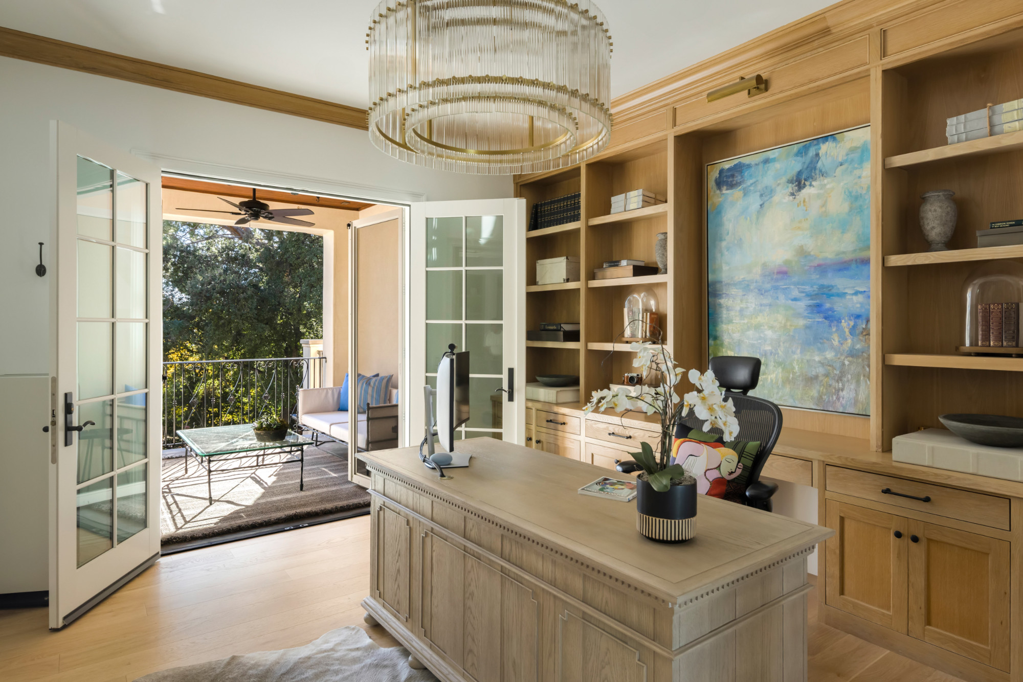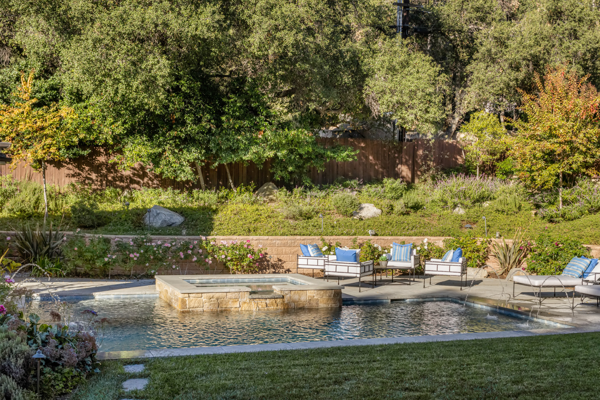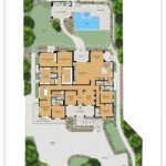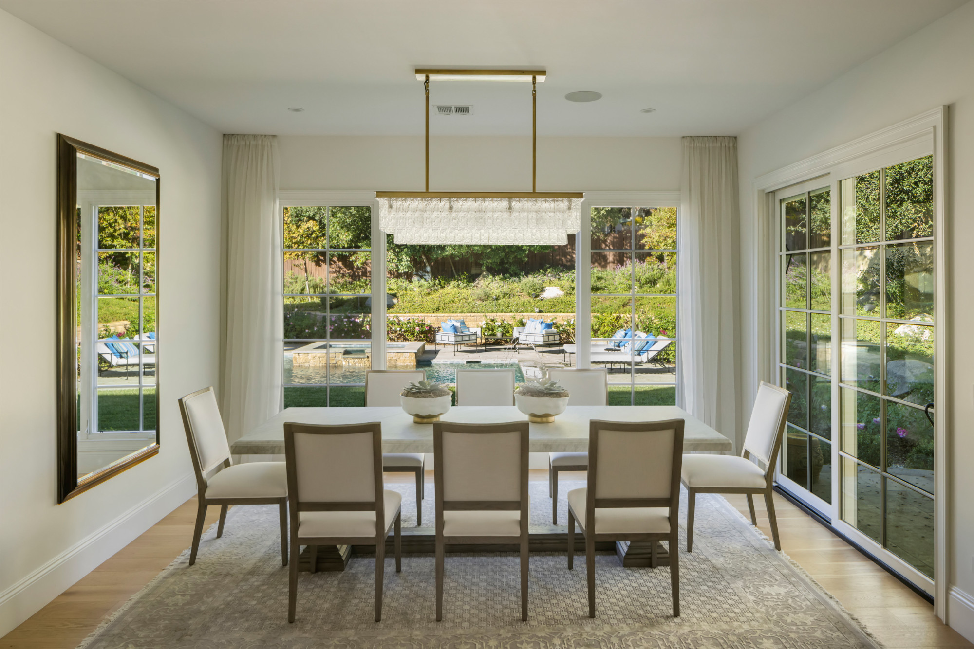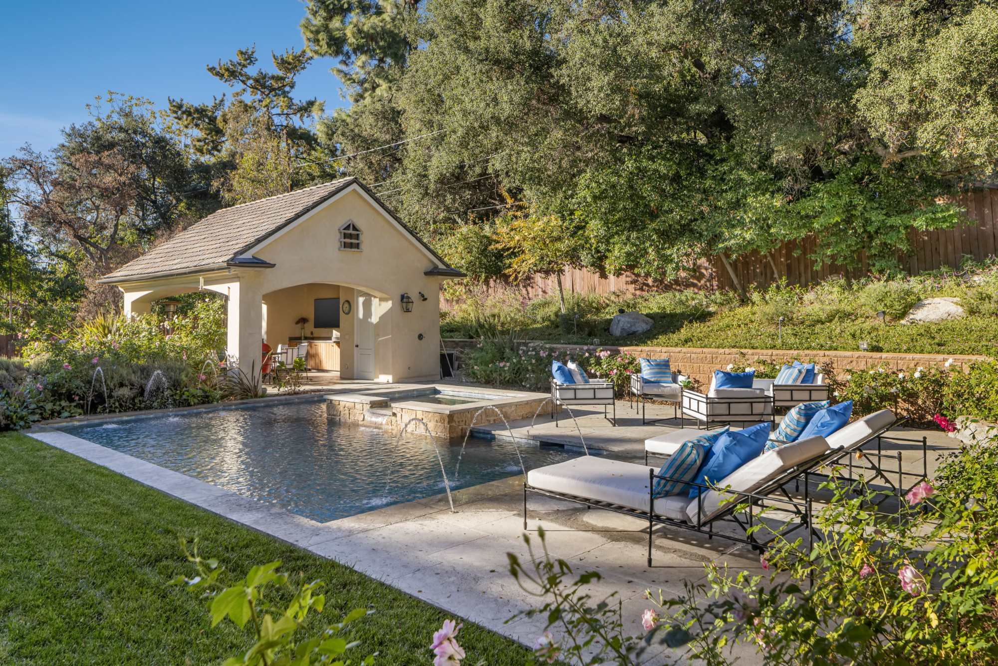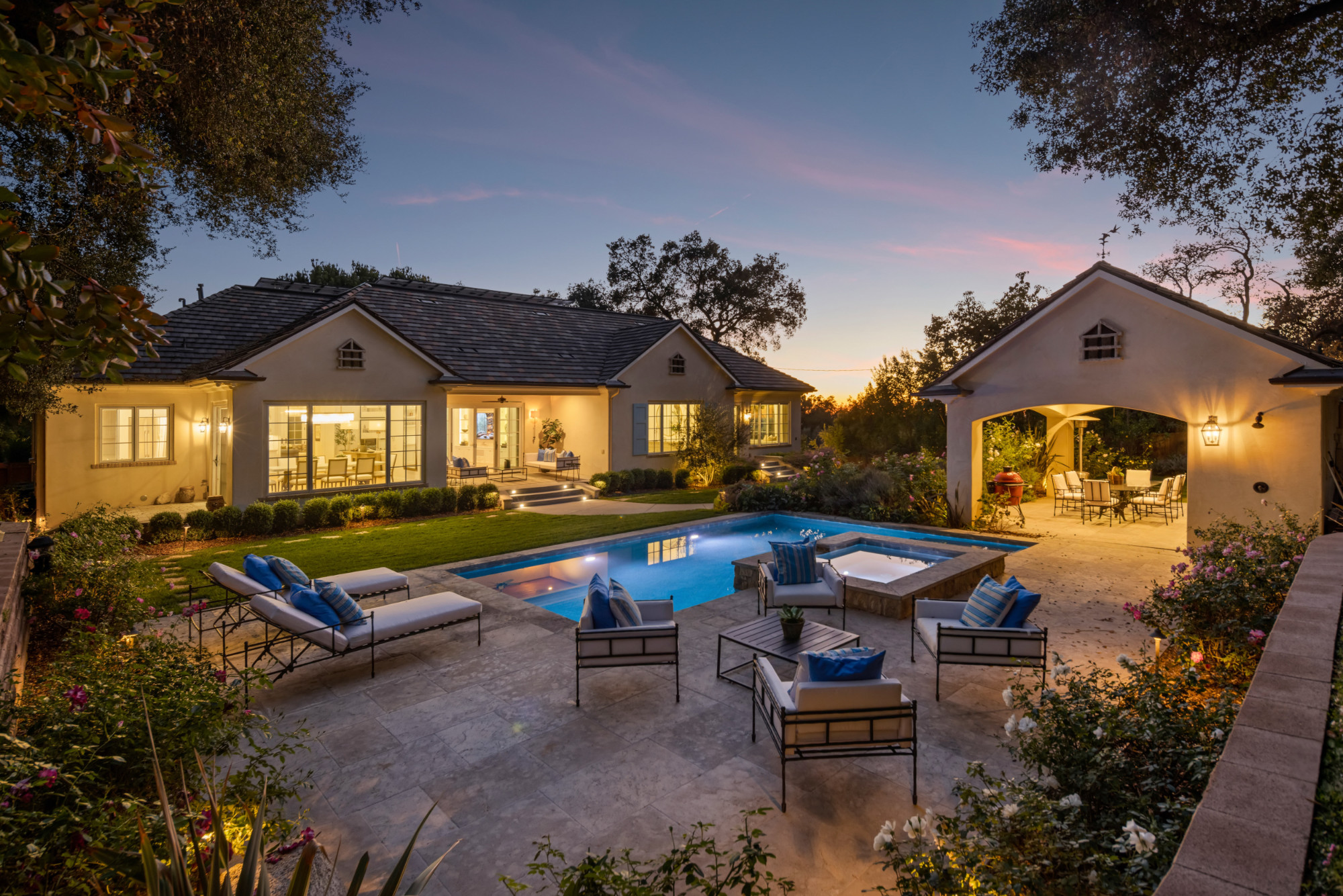 Set on a .53-acre lot, the grounds are calm and private, centered around a saltwater pool and spa that enhance the home’s resort-like atmosphere. A poolside cabana with its own bathroom provides the seventh bath and is ideal for outdoor living and entertaining.