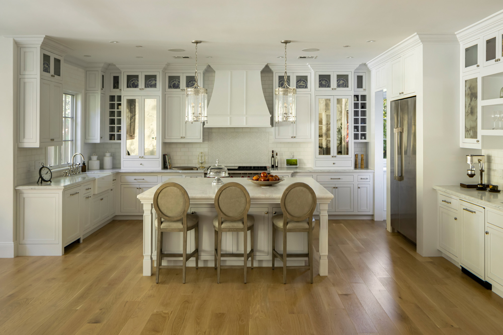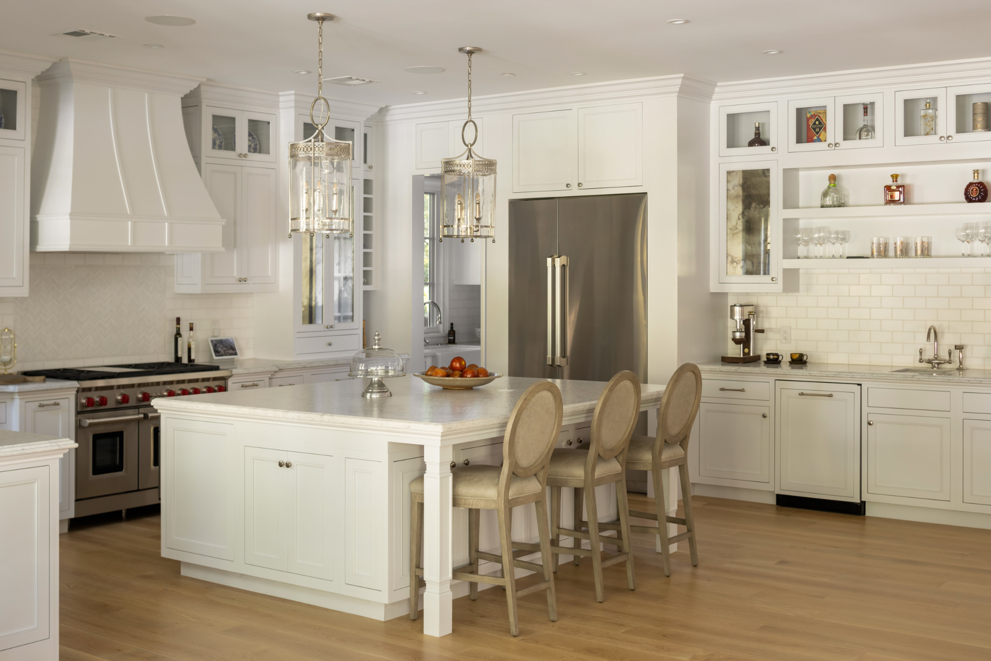 At the heart of the home, the chef’s kitchen opens seamlessly to the family room and dining area, creating a cohesive living environment framed by lush garden views. A generous walk-in pantry supports both everyday living and entertaining. Additional living spaces include a formal living room, two fireplaces, and two separate office spaces, allowing for work-from-home flexibility and quiet separation when needed.